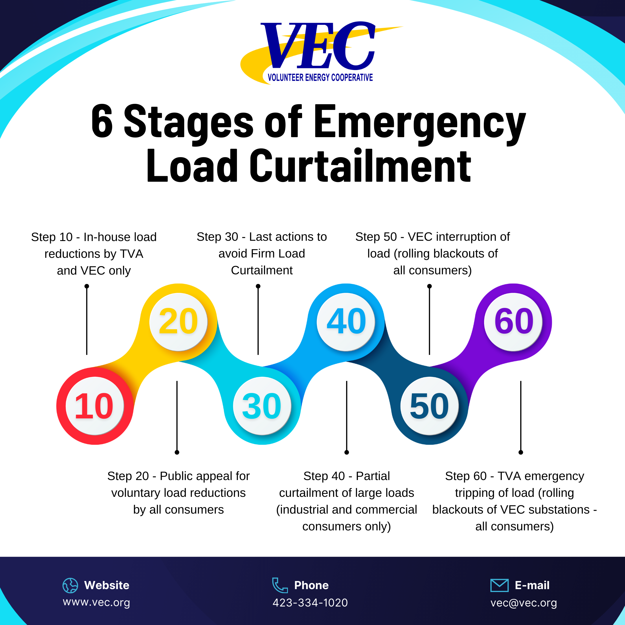 • Step 50 – TVA will call on VEC to reduce electric load by disconnecting a percentage of the circuits fed out of VEC substations (rolling blackouts).